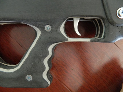 I think the only innovative design aspect of the gun is the stock I made for it. It's a clamshell! It's made out of flattened and laminated ABS DWV pipe. I cut the shapes out using a soldering iron with knife attachment. I joined the layers using ABS cement. And I devoted long hours to sawing, carving, and sanding it for ergonomics. There is an upper and lower receiver which are easily joined/separated with a single bolt and wingnut. I really enjoyed working with ABS because you can weld it, melt it, glue it, cut it, drill it, bend it, impress it, and even mold it too. You have to be careful about what you breathe so I invested in a respirator with a charcoal filter. This was handy for using the soldering iron on the plastic!
