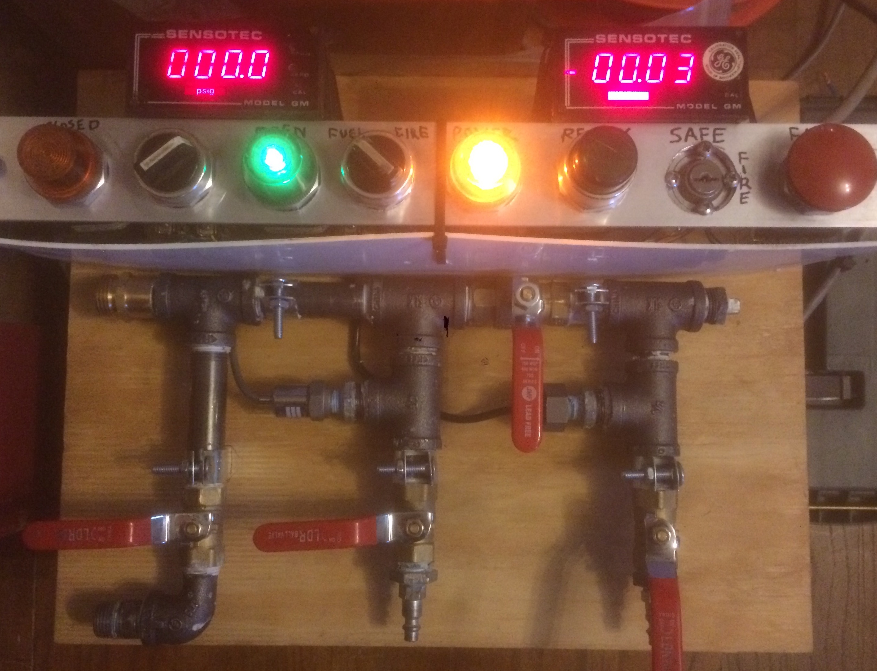 This is the most recent fueling set up. Controls for the actuated valve on the left and firing on the right. Air and propane are the two quick connects, the brass fitting is the hose to the cannon(just a standard garden hose). Lower left is the vent.