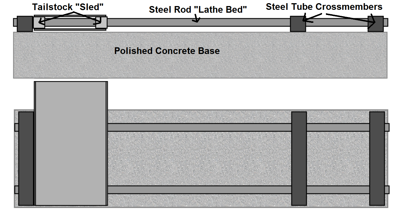 The plan is to use three 6-inch lengths of steel tube to support two 1/2 inch steel rods as the lathe 'table'.  At five inches apart, with the maximum distance between supports being 18 inches, it should be stiff enough to work aluminum and brass at the least.  I'm hoping it'll be able to handle iron and softer steels , but I won't be too disappointed if it can't.   Here's the schematic I've come up with so far: I'm planning to improve the stiffness of the overall design by bolting the entire assembly tightly to an extremely smooth concrete block. I think the concrete will help prevent a lot of bending and twisting. Even if it doesn't help (but it should) it'll add some mass to the lathe and keep it from sliding around, so I won't have to bolt the thing to a table. Win!
