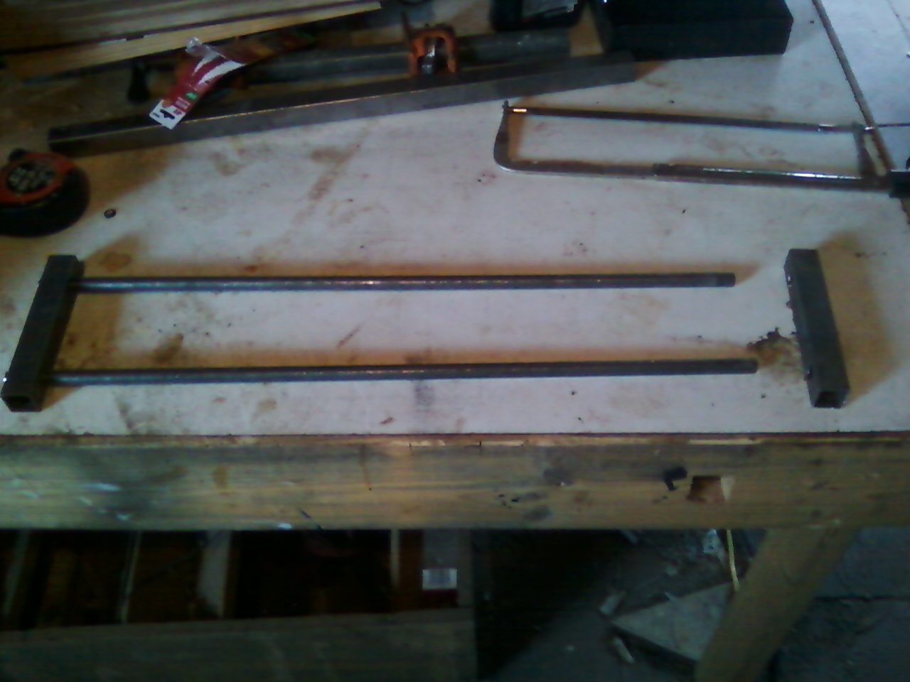 I decided to cut the steel square tube with a hacksaw instead of my angle grinder. A little more finesse is never a bad thing. Pardon the poor picture (cell-phone camera). Anyhow, never ignore the usefulness of a good centre punch; drill bits have a tendency to wander, even if you have a drill press. One of the steel rods, with just enough chamfer to allow it to start in the holes in the steel tube, but still achieve a tight fit. This was about as far as I've gotten as of this evening. I'm leaving the parts as they came from the store until the lathe is almost completely finished. I figure if I give the whole thing a good tight fit, any moving parts (the tailstock sled and the tool carriage) will be nice and snug - but still movable - after I polish everything down.