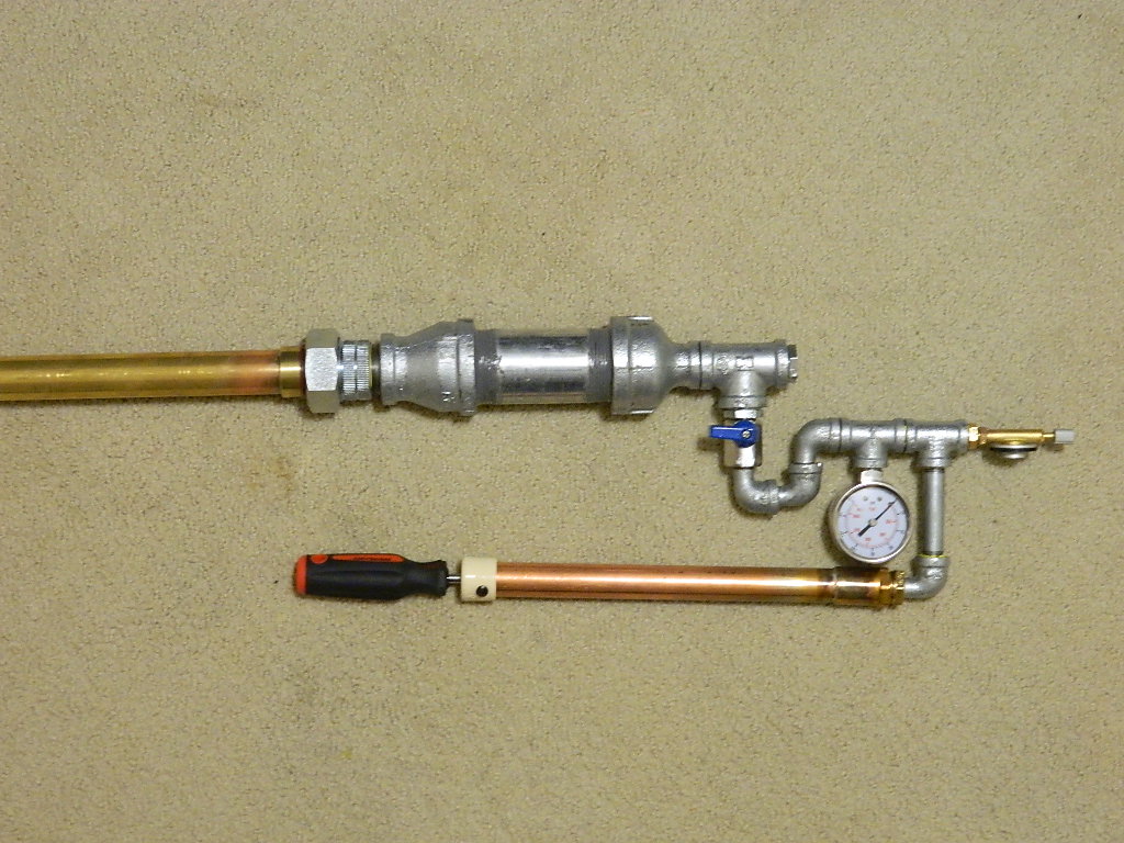 I've started this hybrid project a few weeks or so ago and the parts came in and now I've got something together. I'm waiting on a 14mm spark plug that's coming in the mail that will thread into the adapter on the back of the 1/2 tee. It's got a hand pump I made that goes to 120psi pretty easy. In case you're interested I included the volume diagram and final equation for this air-through meter design which takes into account the volume of the meter.