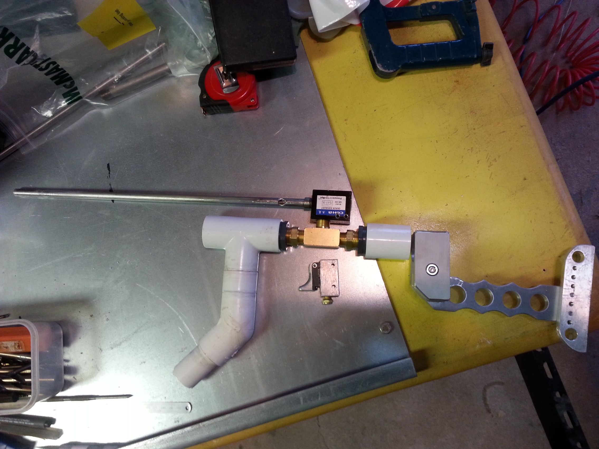 The lower body is the chamber, 1" PVC. The main valve is a 3/8" QEV off Ebay, trigger is a 1/8" 3/2 limit switch.