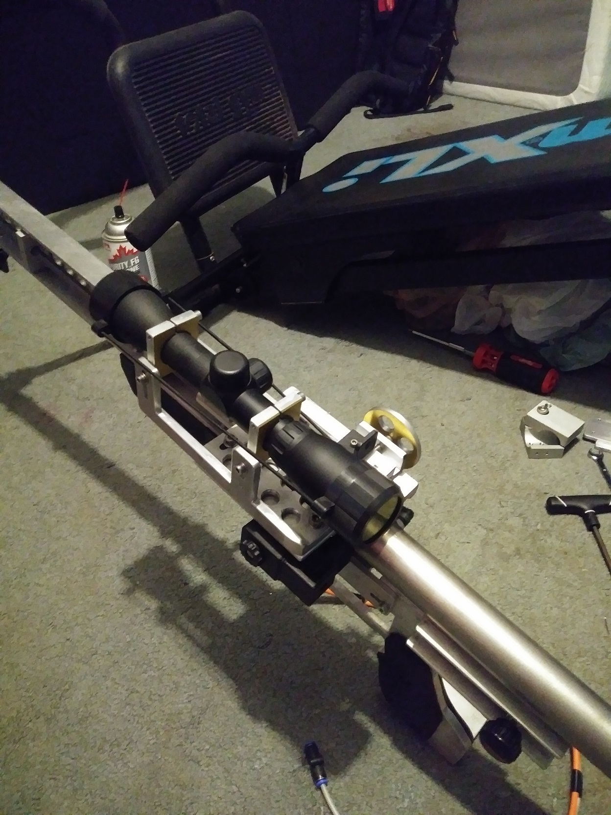 Following on with the KISS principal I have changed the barrel to 6mm ID to use airsoft, I made the barrel slide now so the dead space will be minimal + less leaks. The tube I got from McMaster Carr is 8 x 6mm but was only 5.85 ID :( Much polishing later with a long rod and abrasive cloth and a BB rolls down it. Haven't tried it yet. Also mounted my old 4X scope offset to the left of the peep sights so I can use it as a spotting scope :idea: