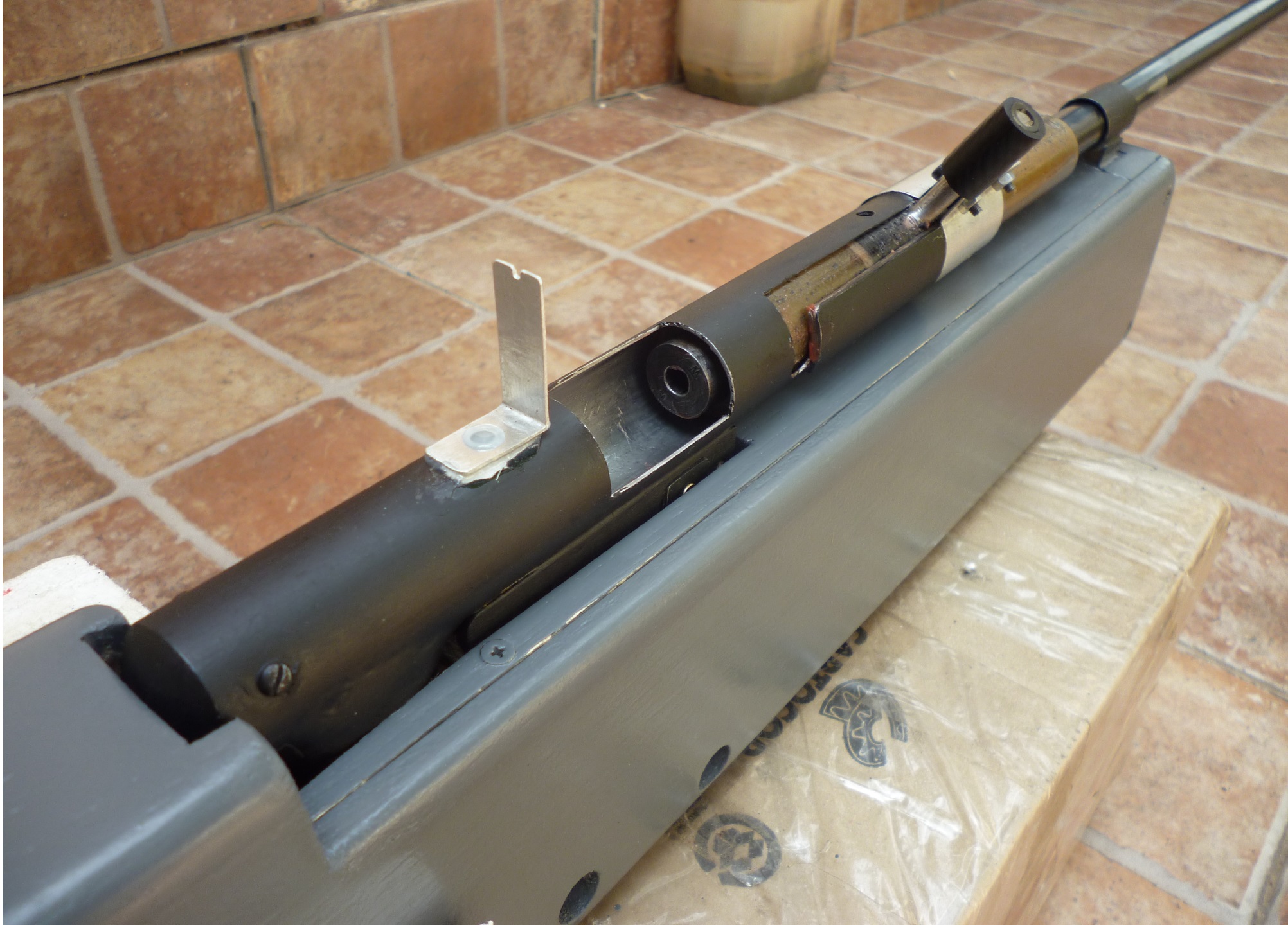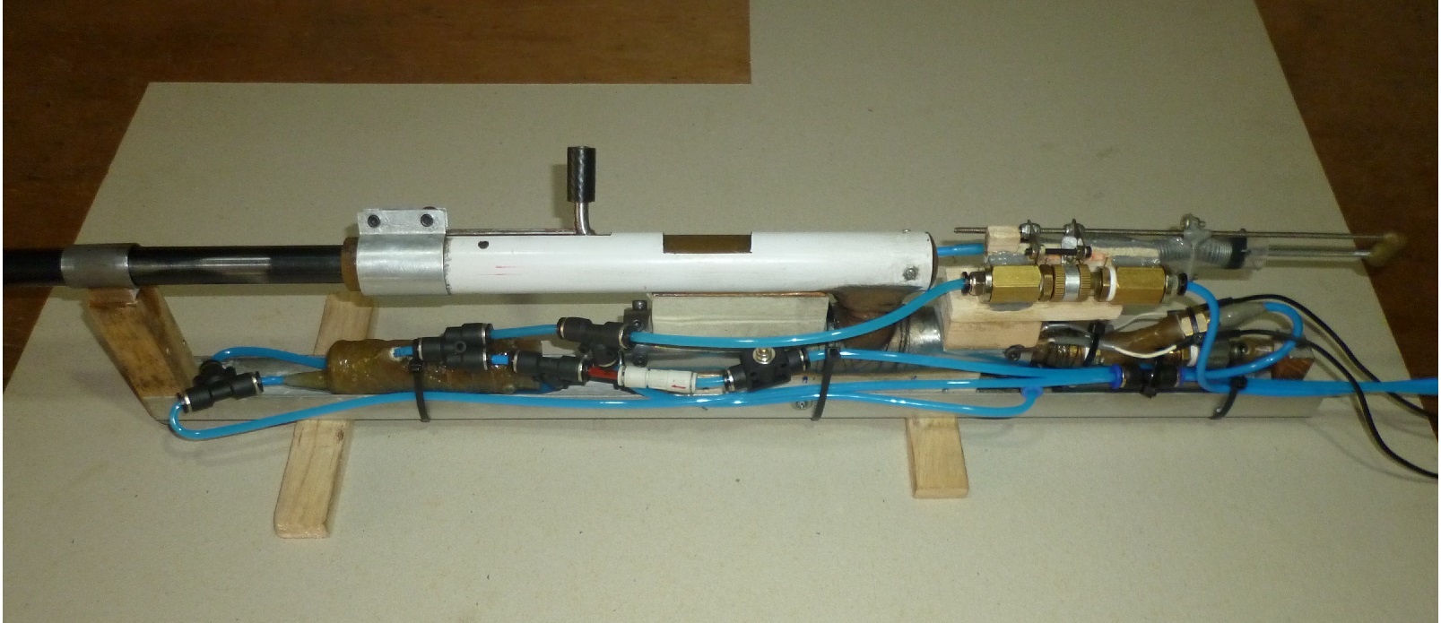 The "Pneumatic timer" is used to determine the gas inlet time to the doser, about 1.5 seconds. The idea is simply to pull the handle and release. This automatically performs the opening and closing of the exhaust valve, the gas charge and its dosage, and the butane-air mixture charge in the combustion chamber. The system is relatively wasteful, a little air, (is a problem that solves many other problems, more important), in favor of having on board the weapon, the smallest possible number of elements.