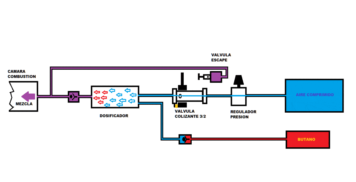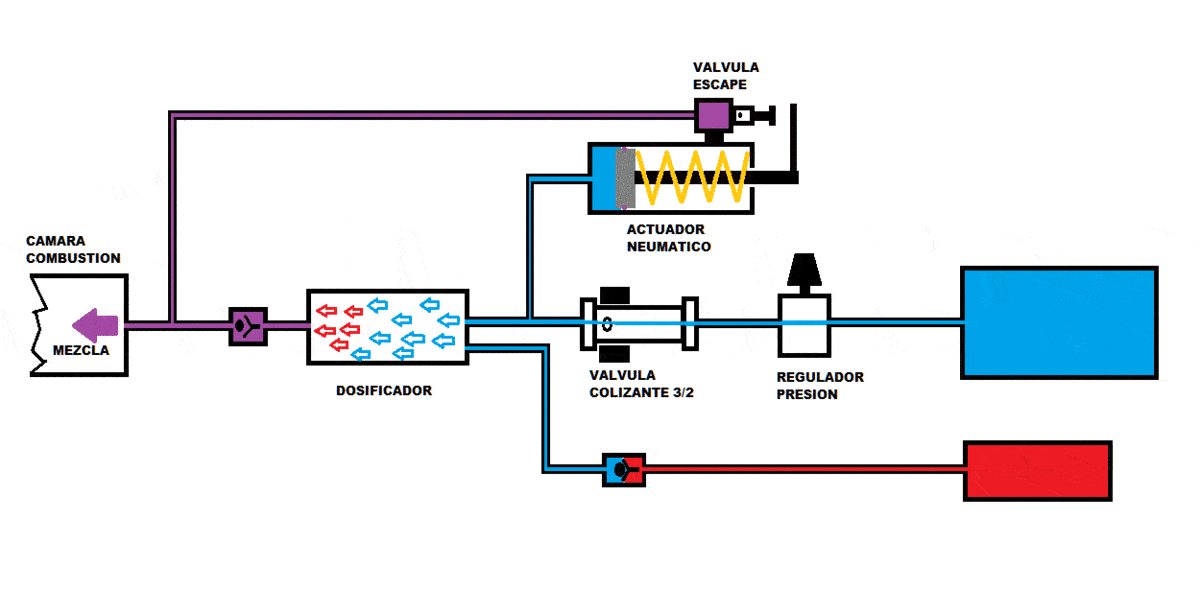 All this is for small hybrids, which is what I do. I have not tried it but I'm totally sure it works well. It barely has a doser, a check valve, and a colizante valve with exhaust, (three ways, two positions), I mean with all this, the dosing system, and power. It no longer has any pneumatic actuator. Just move the valve one second, (as the animation shows,) and release it, and you have the combustion chamber, (any), with the built-in mix, ready to shoot. Very practical. Al final esta la animación.