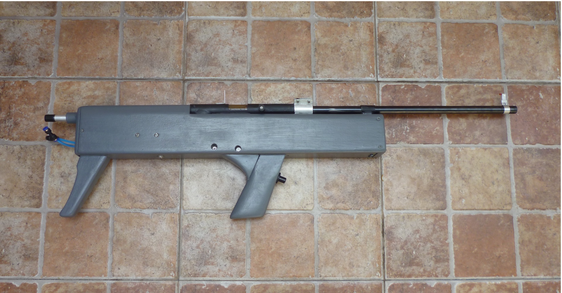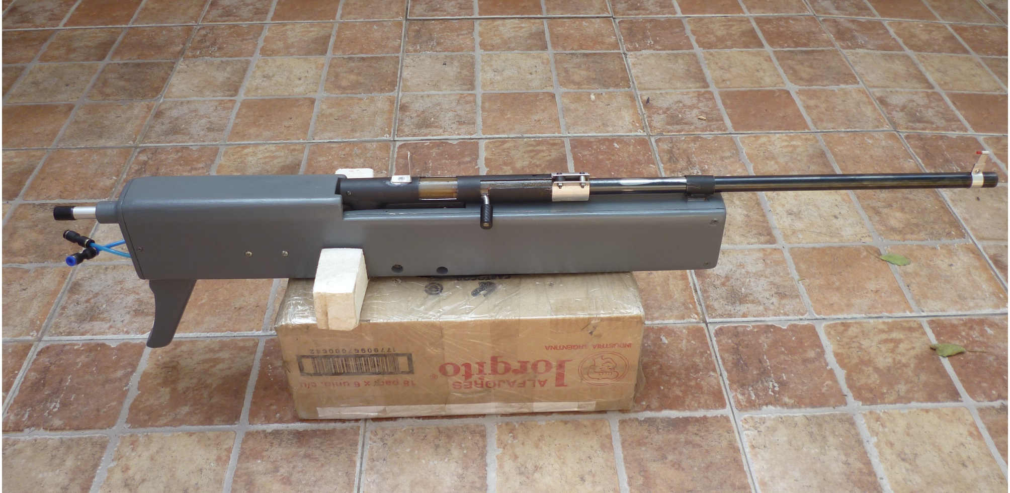 The "Pneumatic timer" is used to determine the gas inlet time to the doser, about 1.5 seconds. The idea is simply to pull the handle and release. This automatically performs the opening and closing of the exhaust valve, the gas charge and its dosage, and the butane-air mixture charge in the combustion chamber. The system is relatively wasteful, a little air, (is a problem that solves many other problems, more important), in favor of having on board the weapon, the smallest possible number of elements.