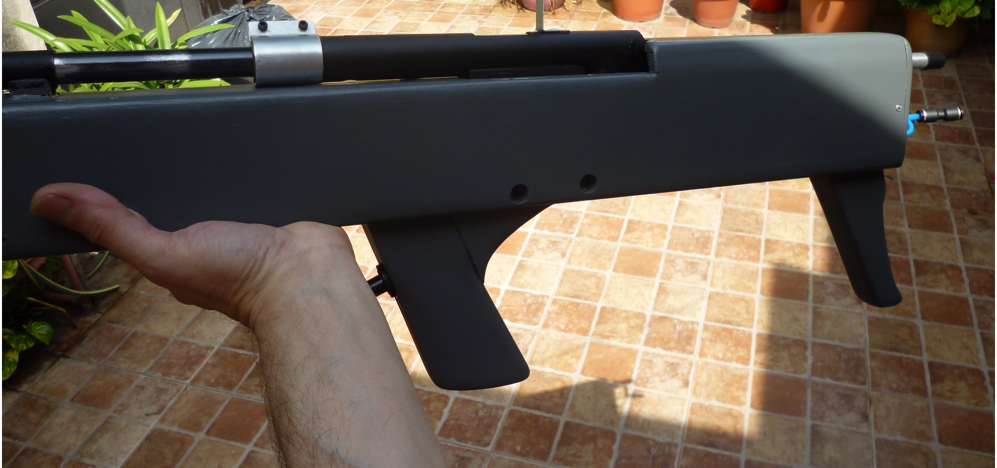 Update of this 5X hybrid prototype, .25 caliber that shoots pellet. I have built a fairing in light wood, and I have installed an open sight to aim. It works excellent. I am using it to 5X to tweak a little. In the previous photos it looks like the interior, the machine. I have replaced the dosing cylindrical tube, with 1.8 meters of 2.5 mm inner diameter hose, and that gives me the butane dose. This idea simplifies everything and it is not necessary to have to build a dispenser. Simplification works well, and the gun fires normally. If you want more gas the hose should be longer, and if you want less, shorter. It is rolled inside this weapon, the HA-V.