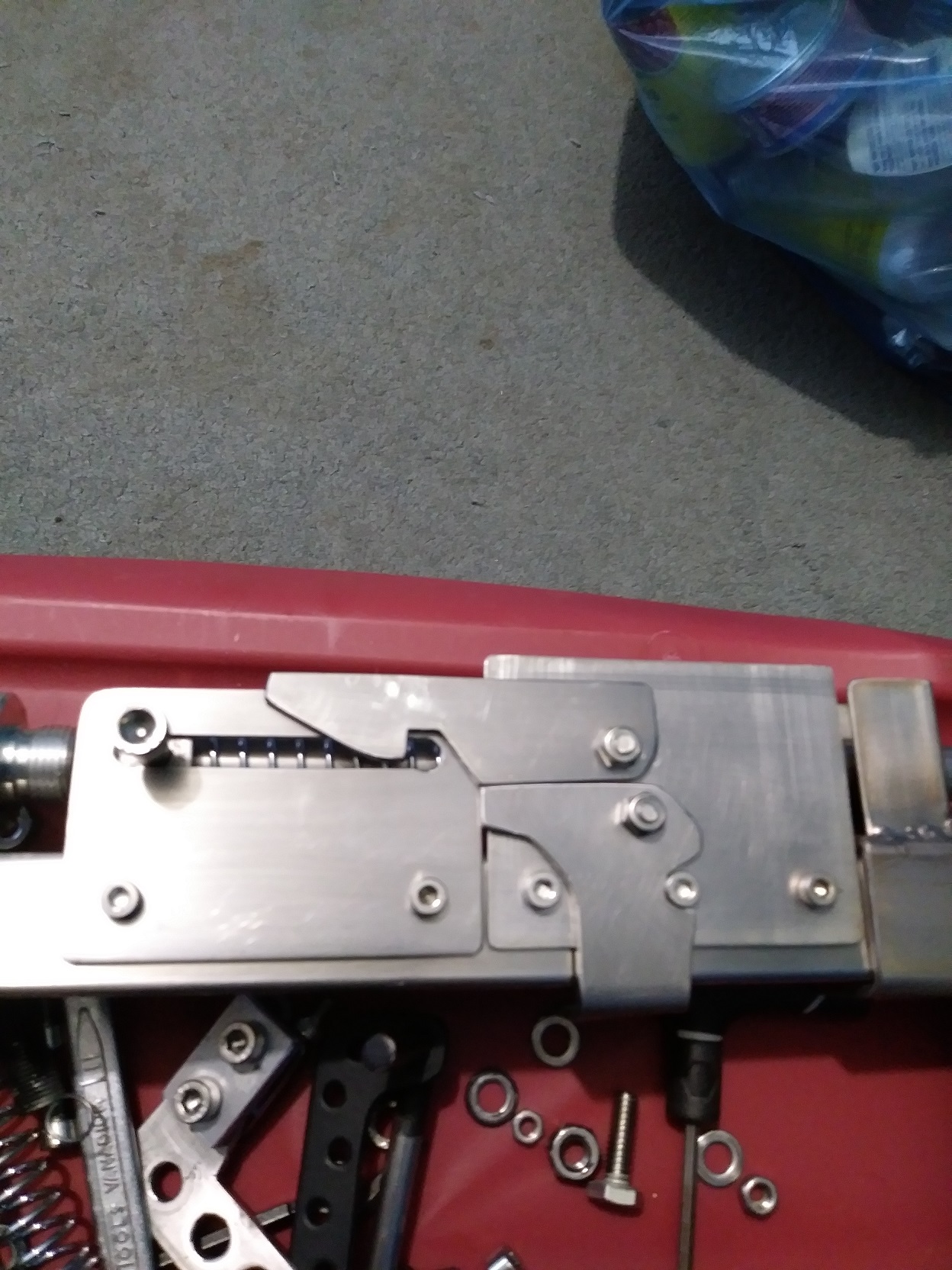 A bit of progress, bracket in the middle is for the grip, sprig guide needs a locking collar for the charge handle to push on, trigger not figured out yet or linkage to rear to load.