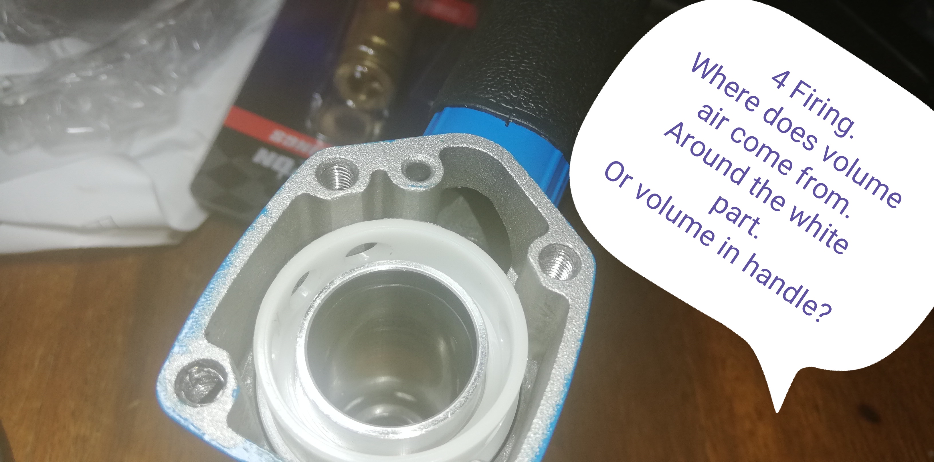 Seperate chamber around piston valve from handle. (handle and around valve seems volume expelled. Maybe different if had the staple piston. Any how.
