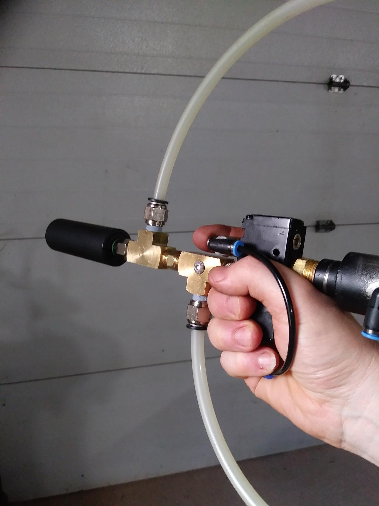 I sort of made a full auto pistol from pieces I screwed together, the chamber is the only piece fabricated. Holds 130 bbs, rate of fire is insane, can get 4 bursts if I'm quick on the trigger. Compressor connects to the small fitting on the chamber at 150psi. The valve is a 5/2 1/8"' port pilot operated, the trigger is screwed into the valve and takes air from the normally open port. Want to try a T fitting on the magazine tube to make filling easier.
