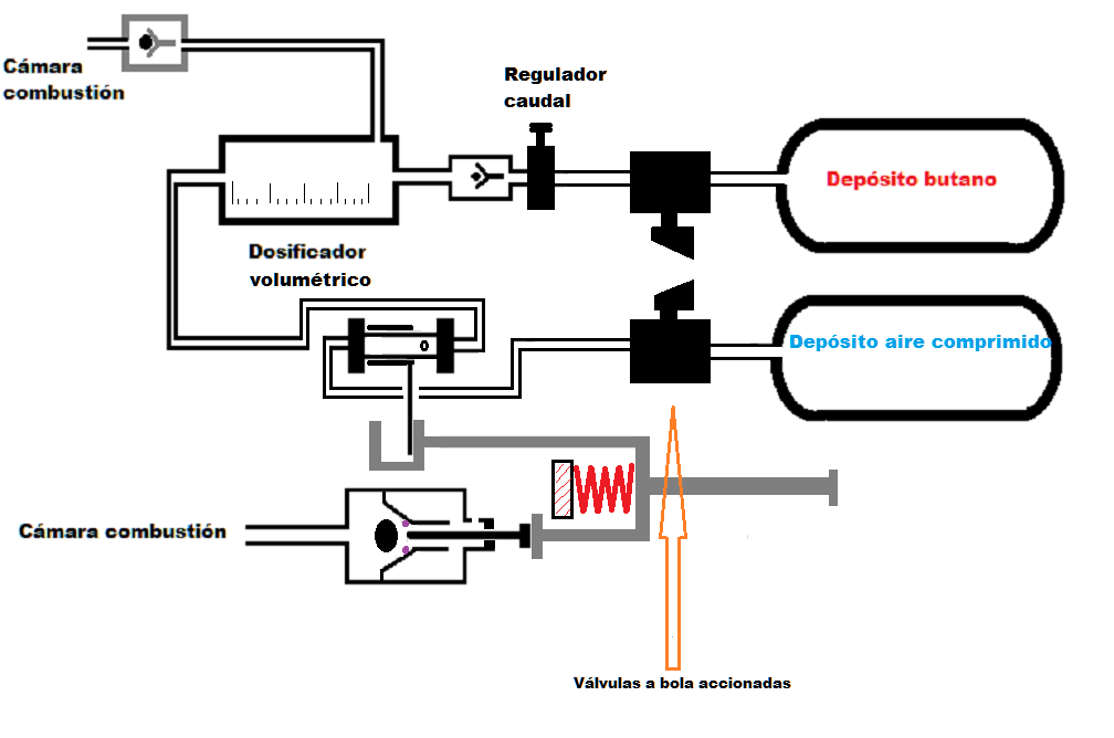 The simple solution, is to add to the spawn, a ball valve common and small, as it is drawn, of manual operation. After firing, the system automatically clears the combustion chamber, charges the butane gas in the doser, and the ammunition in the firing barrel.