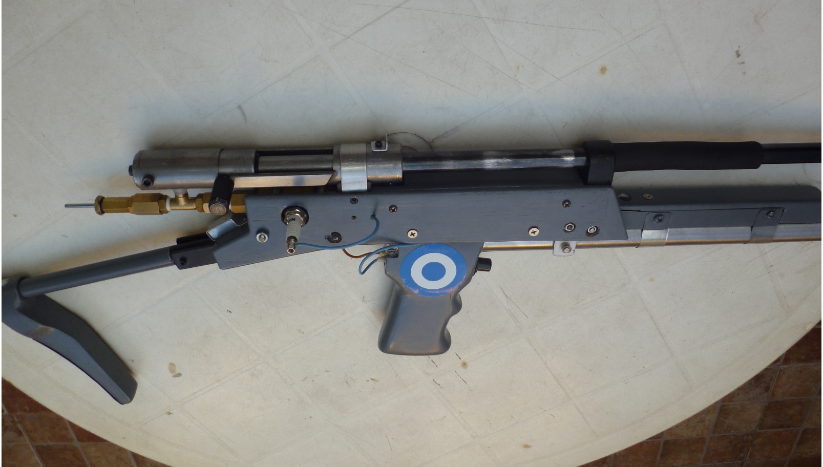 This is a project called "Armadas 1500 II". It is a weapon that works with an integrated air pump, it is a single shot, hybrid that precompresses at 8X - 10X.
