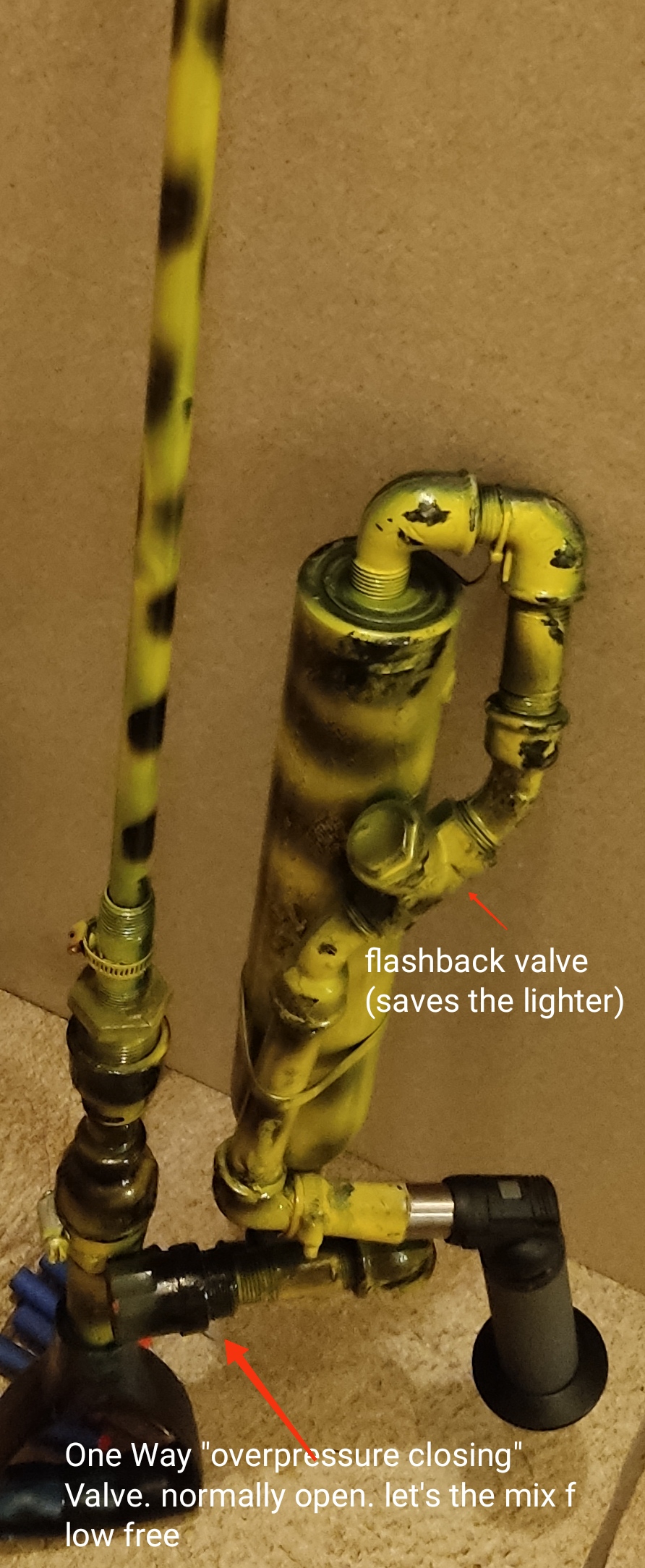 I wanted to get the perfect fuelmix "out of the box", so I use premium lighters with high output and some one-way valves to make sure, the mix can flow without any resistance and provides enough pressure for closing the required valves and fire my bottle.