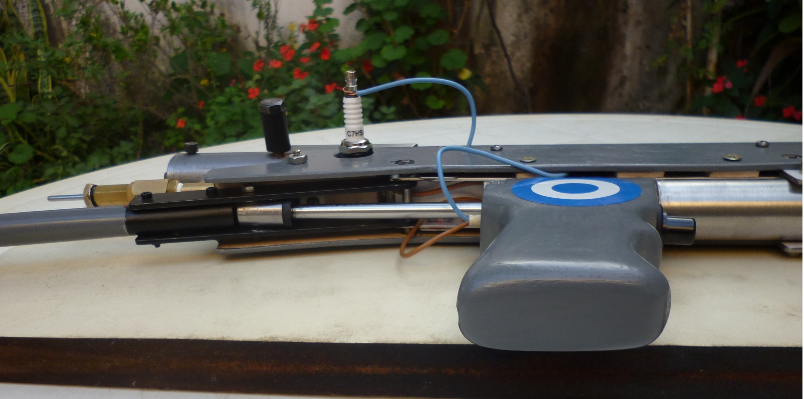 The front tube houses the small liquid butane gas tank, and has its manually operated valve (pressed with the finger), to introduce the gas to the dosing system, about 6ml.
