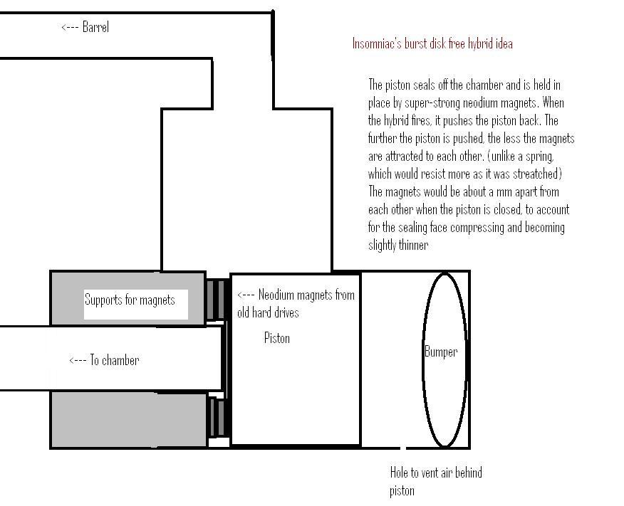 Walking home from school today I had an idea for a burst disk free hybrid. It is like a chamber sealing valve that uses Neodium magnets to hold the piston closed. Do you think it would work???