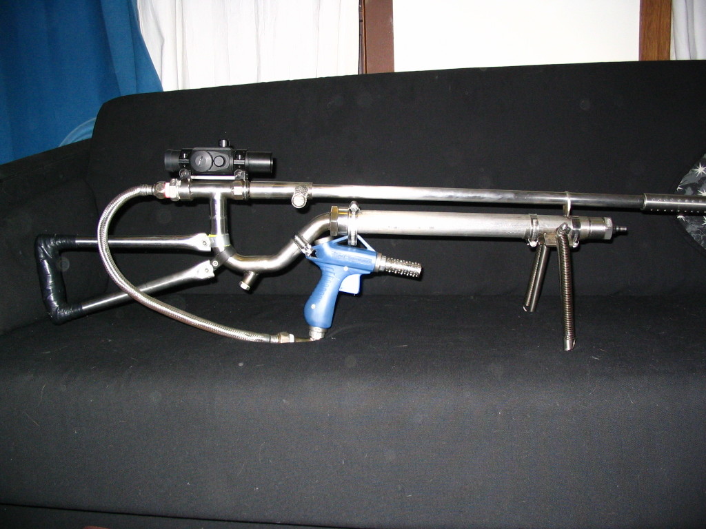 Aesthetics:  - 100mm Muzzle Brake - Walther 30mm Top point Red Green dot scope / custom rail. - 470mm X 50mm silencer - Harris Style retractable/detachable Bi-pod - S/S Braided hose on pilot exhaust to blowgun - Custom S/S mesh pilot muffler Ammo: - 16mm marbles 4g