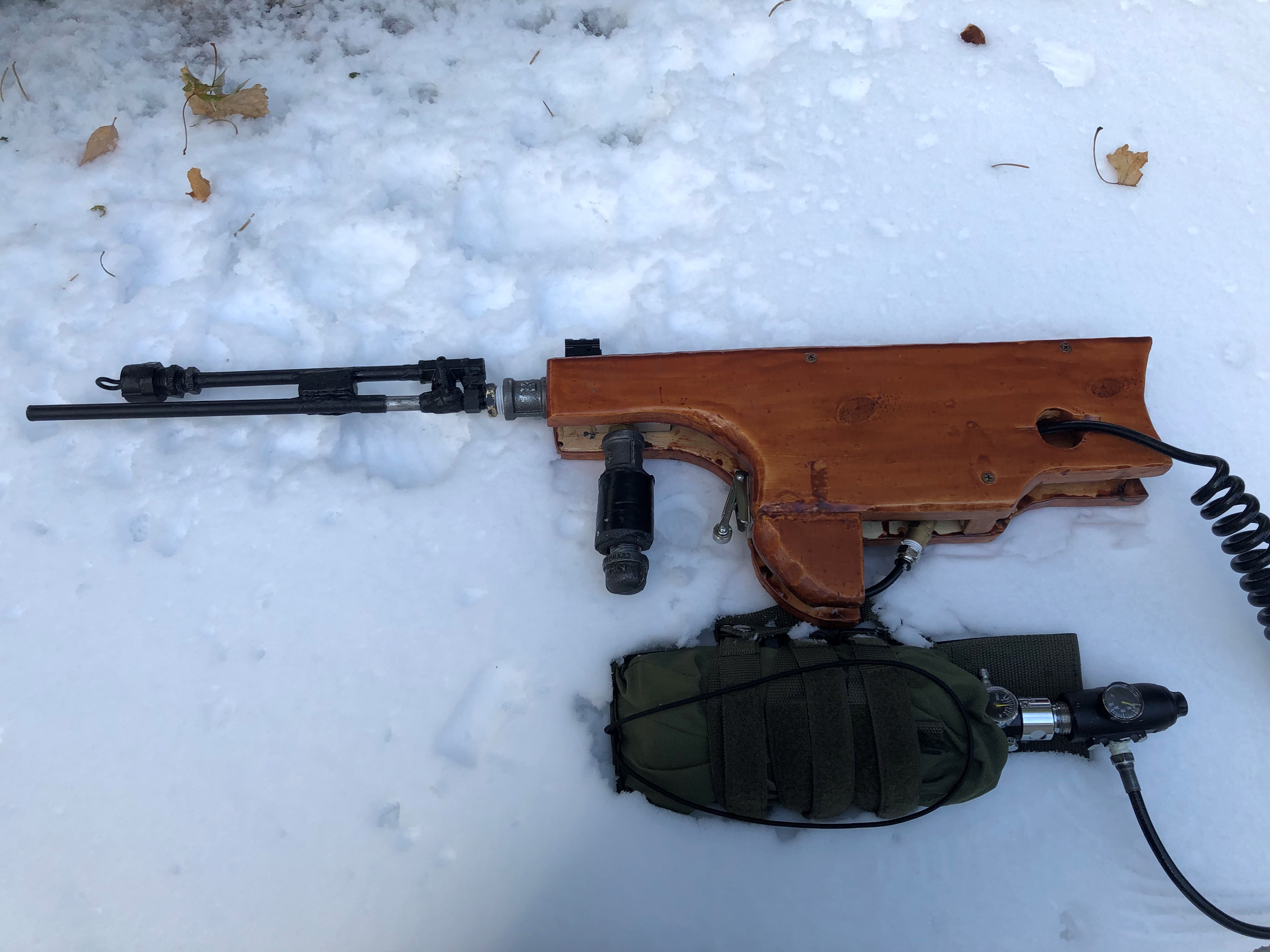 I also got another picture showing the completed cannon with all accessories. This gun continues to be an absolute blast to shoot, and gets fairly good gas efficiency. I get around 50 shots from a tank filled to 100 bar (1450.38 psi).