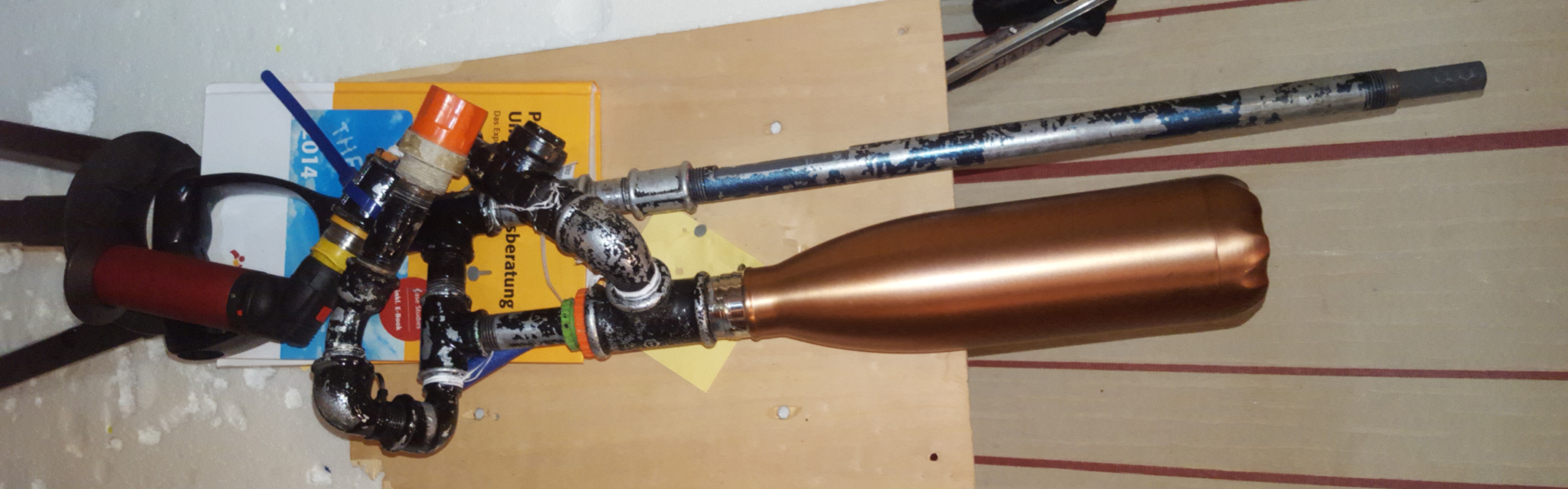 The first valve is a one way valve operatet by gravity. from there the mix goes in the Chamber. it is coaxial in the T-Piece. there is a 1/2 inch steeltube inside. The mix can be filled even if the barrel is loaded, because of the Garden-Stop Valve used as a overpressure valve. It is open during loading the chamber. in the moment of the shot, the pressure forces it to close immediately and all powe goes to the barrel. simple but effective. theoretically i coul use the short pressure impulse through the "waste" pressure for semiauto? dont know. Im happy with this single shot fungun. 12sec loading will pierce 2cm Wood. 18sec loading pierces 169 pages of a book incl. cover. its the impulse i think. this short change of pressure.
