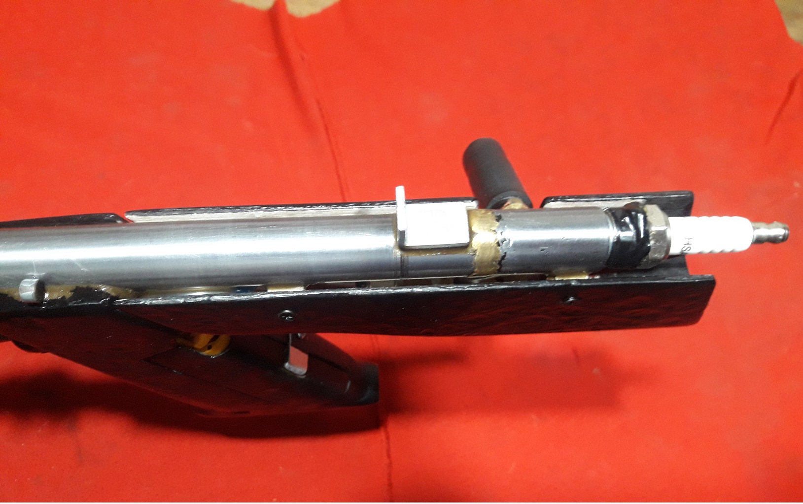 It has a motorcycle spark plug associated with a common piezoelectric spark gap. The design of having the piston above the firing barrel, (a 1/4" copper tube), makes the gun more compact and the barrel longer, about 33 cm.