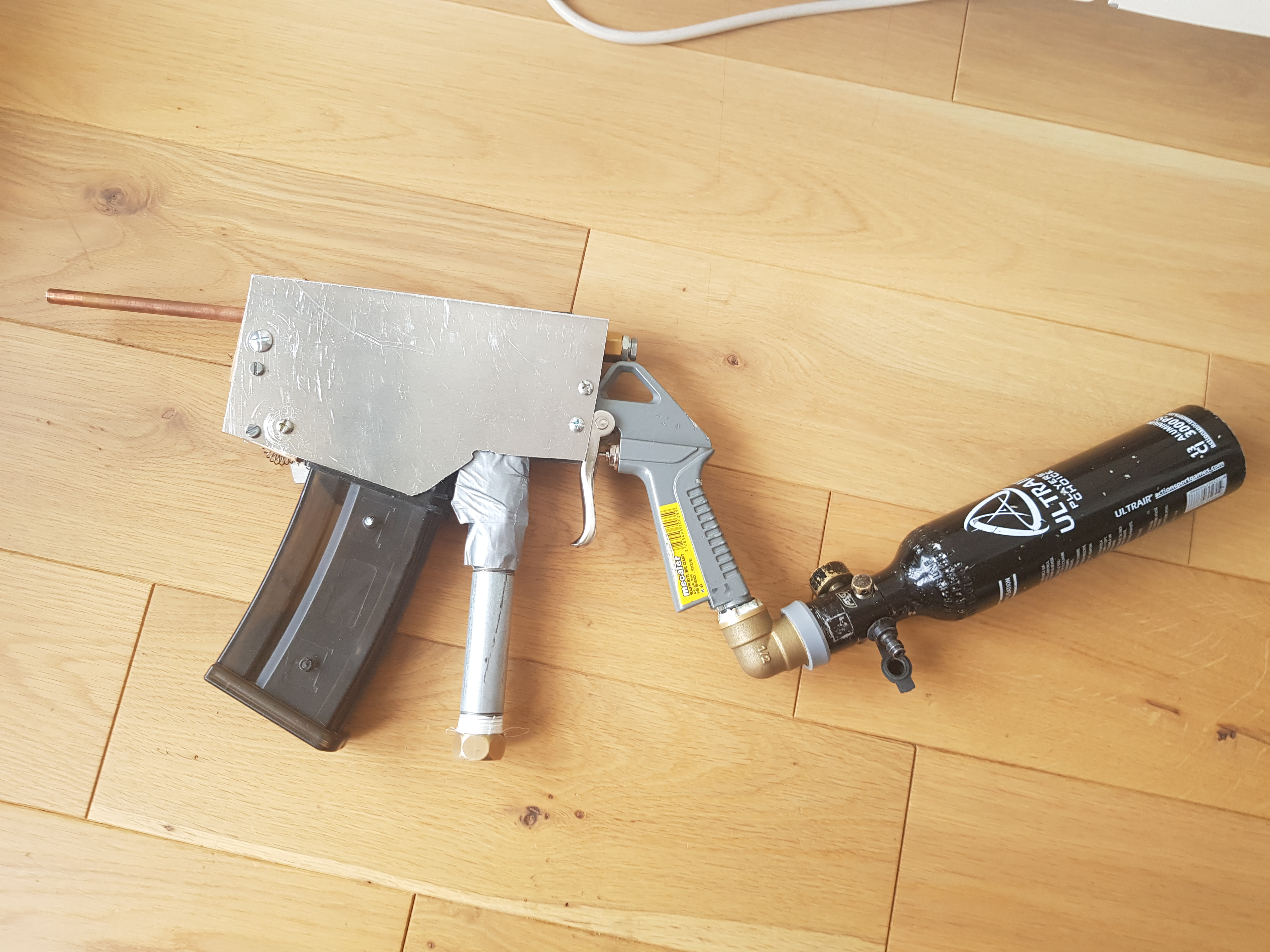 Here is my full auto qev pop off bb gun, it's shooting around 450 fps with 0.30g bbs and about 300 fps with steel 0.90g bbs. It is powered with a paintball bottle with a modfied preset to around 200 psi
